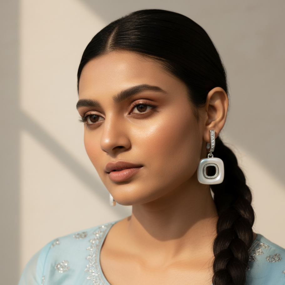 Silver Square Dangle Earrings with Pearl Finish & CZ Accent